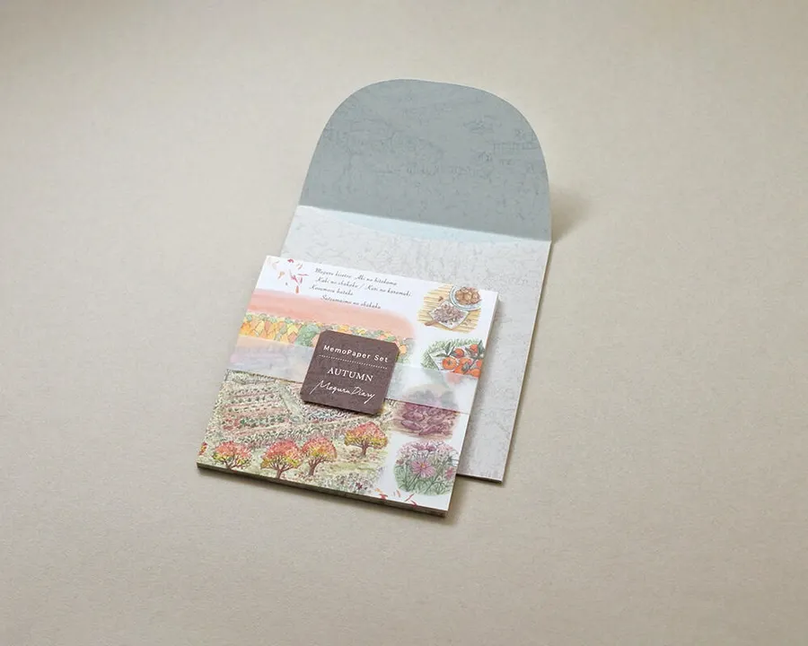 真四角サイズがかわいい小さめの便箋30枚(2種類の絵柄×各15枚)と、持ち運びに便利な専用ケースが付いています。 季節の風景をスケッチ風に描き、季節を感じるひとコマを添え、やわらかな雰囲気に仕上げています。 メモ用紙の裏面にもうっすらと風景が入っていて、ひとことメッセージや、ちょっとしたお手紙に使うときなどにちょうどよいボリュームのサイズです。 ケース付きなので、保管にも便利です。 《内容量》1ケース30枚入 (2種類の絵柄×各15枚) ◆バリエーションは下記の4種類ございます ・〔春〕  ・〔夏〕  ・〔秋〕  ・〔冬〕 - - - MeguruDiary〔めぐるダイアリー〕シリーズ - - - 季節を感じながら巡っていく日々をスケッチしたような、季節感を感じられるデザインに仕上げたシリーズです。 どこか身近でほっとするようなシーンを季節毎に楽しんでいただけます。 - - - - - - - - - - - - - - - - - - - - - - - - - - - - - - - - - - - - -