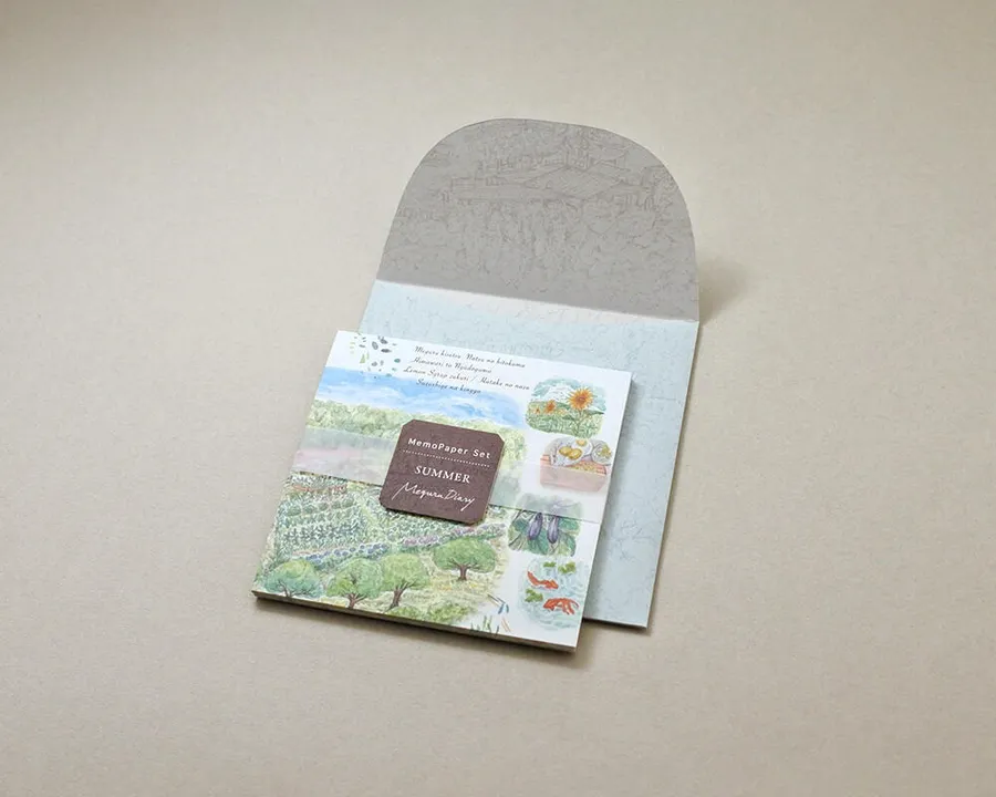 真四角サイズがかわいい小さめの便箋30枚(2種類の絵柄×各15枚)と、持ち運びに便利な専用ケースが付いています。 季節の風景をスケッチ風に描き、季節を感じるひとコマを添え、やわらかな雰囲気に仕上げています。 メモ用紙の裏面にもうっすらと風景が入っていて、ひとことメッセージや、ちょっとしたお手紙に使うときなどにちょうどよいボリュームのサイズです。 ケース付きなので、保管にも便利です。 《内容量》1ケース30枚入 (2種類の絵柄×各15枚) ◆バリエーションは下記の4種類ございます ・〔春〕  ・〔夏〕  ・〔秋〕  ・〔冬〕 - - - MeguruDiary〔めぐるダイアリー〕シリーズ - - - 季節を感じながら巡っていく日々をスケッチしたような、季節感を感じられるデザインに仕上げたシリーズです。 どこか身近でほっとするようなシーンを季節毎に楽しんでいただけます。 - - - - - - - - - - - - - - - - - - - - - - - - - - - - - - - - - - - - -