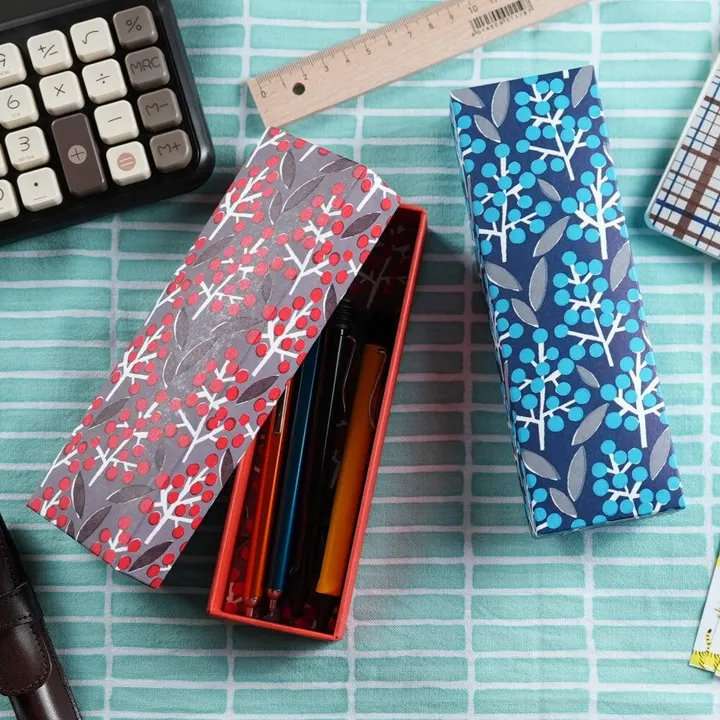 伝統文様と職人技が織りなす、美しく実用的なペンケース。「幸せの文様」シリーズは、日本の伝統文様が持つ「幸せを願う意味」に着目し、テキスタイルデザイナーとともに生み出したFuwa Marketオリジナルデザインです。南天は「魔除け」「厄除け」として古くから親しまれてきた植物。縁起の良いモチーフを現代のライフスタイルに馴染むようモダンにデザイン。京都の貼り箱専門工場で一点ずつ丁寧に仕上げ。ペンケース・眼鏡ケース・小物入れとして活躍。手染め和紙は京都の職人が一つひとつ手作業で仕上げ、深みのある色彩と独特の風合いが魅力。サイズ:約19cm×6cm×4cm、重さ:約80g、素材:手染め和紙、紙(無地)、生産:日本(京都)。