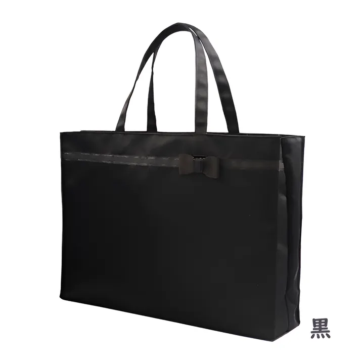 きちんとした印象を大切にした横型タイプのトートバッグです。 ネイビーとブラックの2カラー展開です。 リボンをブローチ型にし、簡単に取外し出来るようになっています。 リボンを外すととてもシンプルですので、男性の方でも違和感なくお持ち頂けると思います。 ポイントに光沢のあるラインの入ったテープをあしらっています。 ベーシックなトートバッグは学校説明会や学校行事から普段使いまで幅広くお使いいただけます。 横マチもゆとりの10センチサイズ。 履いてきた外靴やA4サイズの封筒、配布書類もたっぷり収納。 ●ご購入されたお客様の声(一部抜粋) ・A4ファイルや靴などたくさん入れられて、シンプルなデザインで生地も上質で汚れがつきにくそう。 入園式に備えて購入しましたが主人も使えるデザインですし、今後の面談や行事でも使いやすく冠婚葬祭でも使えそうなので買ってよかったです。  ・ちょうど良いサイズで軽くてどこへでも持っていける。 ・娘の入園に合わせてデザインが気に入り10年以上前に購入しました。使いやすく本当に長い間愛用しました。 今回娘が通塾するのにこちらのバックを使いたいというので私の分と二つ新しく購入することにしました。