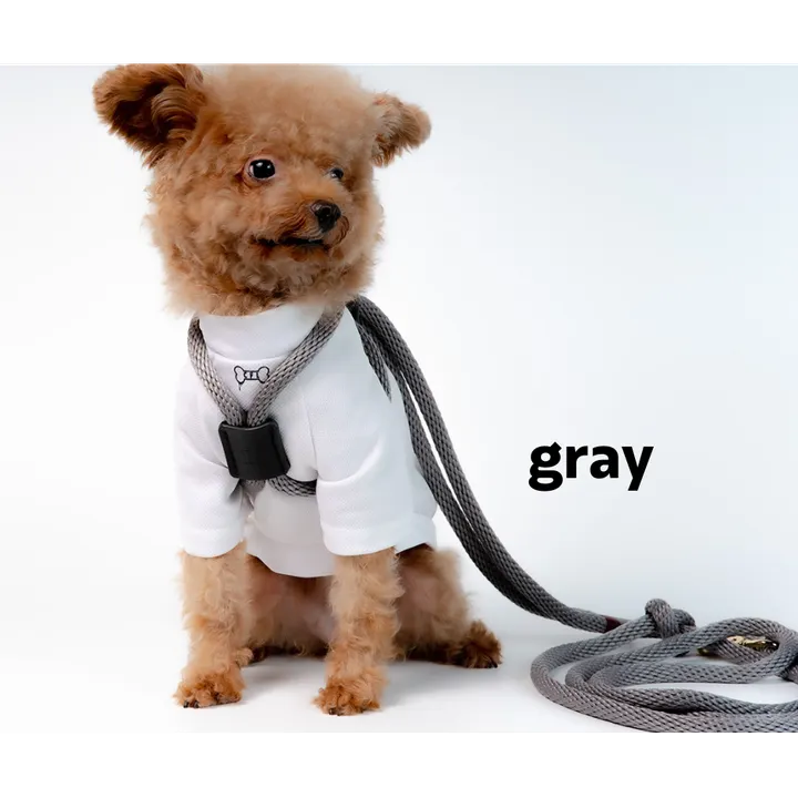 ハンズフリーリードとハーネスの一体型アイテム。 柔らかく、耐久性のあるブレードロープを使用した設計で、簡単に装着可能。 装着を嫌がるわんちゃんへの負担も軽減します。 ジャストサイズで着用できるためわんちゃんが後退りしても抜けにくく、厚手のアウターを着用していてもにフィットします。 また、ハンズフリーリード機能を搭載しており、肩掛けで両手が自由になるため、散歩中の利便性が大幅に向上。 ナスカンと丸カンのシンプルな2つの金具のみを使用することで、軽量でありながらしっかりとした機能性を実現しました。 無駄を省いたシンプルなデザインは、持ち運びや装着の負担を軽減し、飼い主様とわんちゃんへ快適さをお届けします。 ~装着方法~ ①ロゴが押印してあるアジャスターを下に下げる ②輪に頭を通す ③2つの輪ができるので、前足をロープの輪にくぐらせる ④胸元のアジャスターを上に上げる(首元の調整) ⑤背中にアジャスターをきゅっとしめる(胴体の調整) ~アジャスターについて~ レザーアジャスター部分ですが、経年変化によりロープが伸びることや、レザーが柔らかくなる特徴を考慮し、あらかじめアジャスターの穴をきつめに作っております。 馴染むまでは片側ずつロープを引いていただくと、スムーズに装着が可能です。 繰り返しお使いいただくことで、徐々に調整がしやすくなります。 ※犬具引張強度試験実施済み ※通常下の使用でしたら約30kgまでのわんちゃんに使用可能でございます。(引っ張りが極度に強いわんちゃんに対しては30kg以下を推奨しております。) 〈color〉 black/gray/beige/burgundy/dark green/navy/camo ※大切な愛犬の安全を守るために、リードや首輪の定期点検をお願いいたします。 使用時の事故やトラブルには一切の責任を負いかねます。 必ず使用前に点検をお願いいたします。(買い替え目安は半年~1年です。) 犬具は消耗品であります。ご使用前に、リードや首輪の結び目、バックル、ナスカン、および素材の状態を注意深く確認してください。 摩耗や亀裂、異常なくぼみがないかをチェックすることもお忘れなくお願いいたします。 リードや首輪に異常な箇所がみられる場合は、使用を止め、速やかに交換してください。
