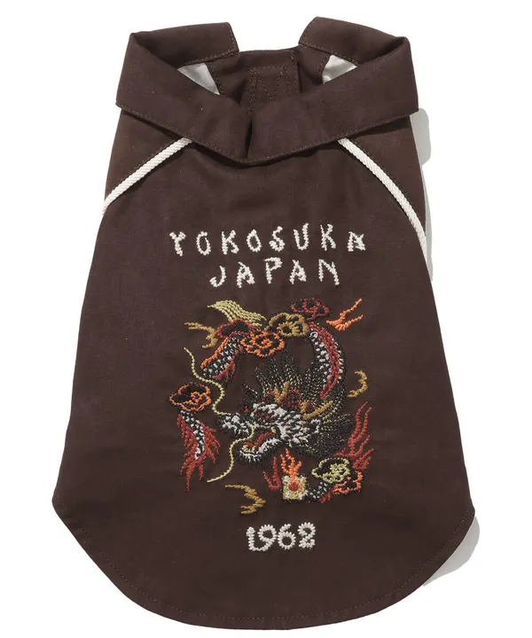 《KRIFF MAYER 秋冬アイテム「DOGスーベニア刺繍JK」》 スエードタッチ素材のスーベニア刺繍ジャケット。 ヴィンテージのスカジャンからサンプリングした龍のグラフィックがインパクトのある一枚。 飾りパイピングテープがアクセントになっています。 伸縮性がないアイテムですが、面ファスナーで前が全て開くので着脱簡単! 他にないドッグウェアで他のわんちゃんと差別化しちゃおう! ※伸縮性のないアイテムです。 ※ハーネス穴はございません。 ※従来のXLサイズがXXLサイズ表記になり新しいXLサイズにリニューアルしています。 ※アイテムによってサイズ感が異なる為、数値をよくお確かめください。