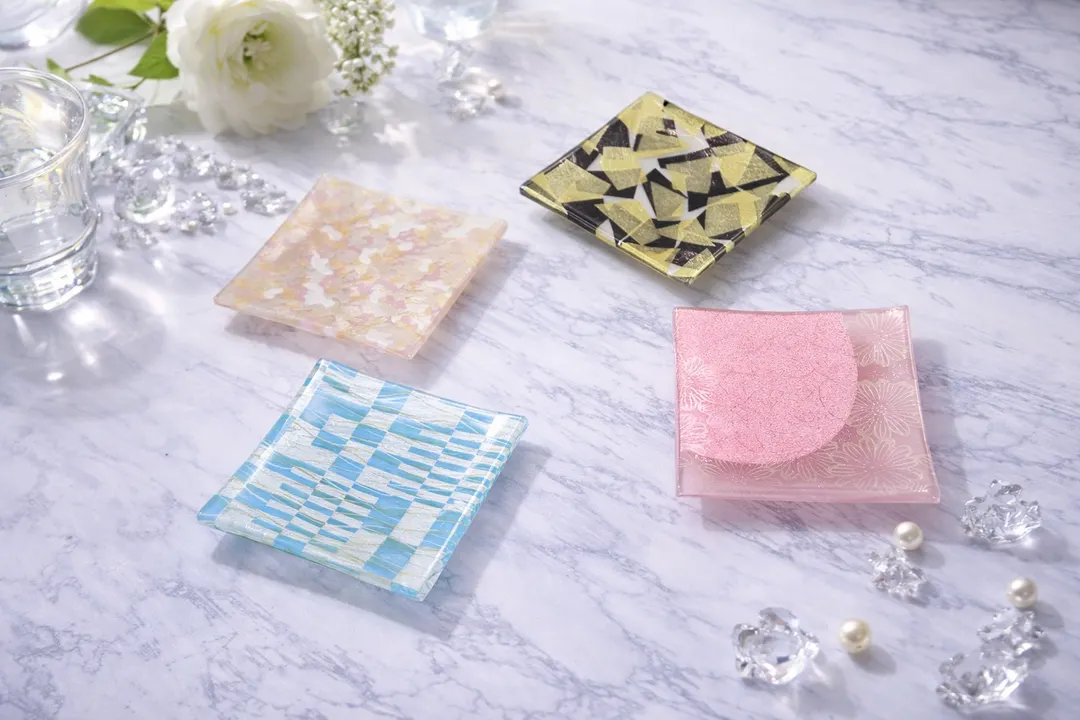 金彩ガラストレイ(豆皿) 「ブルー市松・カモフラピンク・フラワーピンク・モザイク」 金彩ガラストレイ(豆皿)各種
