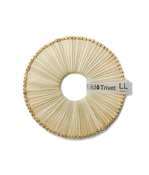 菅の笠から生まれたEldのためのトリベットは、熱々のEldを安定して置けるようにぴったりサイズに作った鍋敷きです。 江戸時代の旅支度に欠かせなかった編み笠の材料”菅(スゲ)”が使われており、かつて釜敷きにも使われた菅は熱に強く、防水透湿性も非常に高い素材です。 水が降りかかると撥水性のある繊維がはじき、湿気が多ければ編んだ菅が膨らんで内部に通さず、乾燥すれば菅が戻り、自然に風通しが良くなる優れもの。 ご家庭に合わせて使いやすいサイズとお好みのカラーをお選びいただけます。 EldスキレットLLや土鍋に最適なLLサイズ。 馴染みやすいベージュ色であるプレーンと本来の色が楽しめるグラスの無地2色は、素材感がお好みの方にお勧めです。 深江菅細工 大阪は深江の伝統工芸品で、江戸時代の旅支度に欠かせなかった編み笠の材料”菅(スゲ)”。 手作業で丁寧に編み込まれた編み目、昔ながらの技法で染められた差し色は、ひとつひとつ風合いが異なり、使い込むほどに愛着がわく逸品です。かつて釜敷きにも使われた菅は熱に強く、防水透湿性も非常に高い素材です。 菅本来の色が楽しめるプレーン2種類の他、ポトペリーオリジナルカラーのグレーとグリーンがございます。