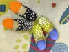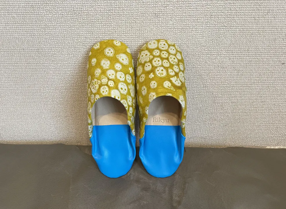 贅沢な全面革仕様のルームシューズ。 丸くて柔らかい形が人気のバブーシュ型です。 モロッコ製のものは,独特の匂いがしたり,色落ちすることがあったり,少し不安な方もいらっしゃるかと思います。 こちらは日本で作られたバブーシュで,接着剤もラバー系を使用しているので安心です。 薄くて軽い革を使用してますのでとても軽く,片足わずか75g。 見た目ガイコツ柄でインパクト抜群。踵はネオンカラーでポップに仕上げました。 カラーはクロとヤマブキの2カラー用意しています。 クロはネオンオレンジと合わせてポップに、ヤマブキは独特の染めムラをネオンブルーと合わせました。 汚れやすいルームシューズも、この革は表面水拭きできますので安心です。 中敷にはフカフカのスポンジ入りで履き心地抜群です。底面は床面(革の裏の起毛面)を使用し、フローリングでも滑りにくく安心です。汚れが目立たないよう底はグレーの革色です。 コーティングしていない素上げ革を使用していますので、足馴染みが良く、通気性も良く、気持ち良く長くお使いいただけます。 サイズ展開はユニセックスで5サイズ揃えました。 足の小さい方から大きい方まで対応できます。 ⚫︎大阪の革の街から職人メイドの商品をお届けします。 商品が生まれる場所は大阪の革の街。 昔から皮革関係の会社や工場が多い地域ですが、年々その数は減ってきています。 そんな中で革に魅了された若い職人たちが、自分自身の腕を磨きながら数少ない後継者として働いています。 そんな職人仲間と共に、見慣れた革製品とは違うものを作ろうと立ち上げたレザーブランドです。 商品には、コラボレーションしている職人のサインや屋号も一緒に入れています。 ⚫︎親子2代のみで染める革 POCOLOCAの軸は素材です。一見革とは思えない質感の凸凹しわしわのガイコツレザー。 これは革の染め職人が失敗から発見し、凸凹の加減を染料により調整することに成功し新しい染色方法として確立させた驚きの染色技法で作られています。 独特の染めムラがどこか民藝的な温もりを感じさせます。 海外でも注目され,大阪の染め工房には外国人観光客が足を運んで商品を買い求めることもあるそうです。 POCOLOCAはこの染めでオリジナルのガイコツ柄を新たに製作し、ここでしか作れない完全オリジナルの革で商品を作っています。 *こちらの商品はひとつひとつ模様の出方が変わります。柄の指定などは一切できません。柄の出方はお任せになります。ご了承ください。 ・・・・・・・・・・・・・・・・・・・・・・・・・・・・・ ⚫︎Collaborated Creators【Room shoes maker Rikyu】 元lady'sシューズのデザイナー&靴職人が作るバブーシュ専門店。動物やフルーツをモチーフにした履くだけで幸せになれるカラフルで楽しいバブーシュを作っています。 ⚫︎カラー ヤマブキ 甲/ガイコツ柄ヤマブキ 踵/ネオンブルー 裏/ベージュ ⚫︎サイズ(内寸、木型サイズ) XS:22,5cm S:23,5cm M:24,5cm L:25,5cm XL:26,5cm ⚫︎素材 牛革、豚革、山羊革、ウレタンスポンジ ⚫︎生産国 日本