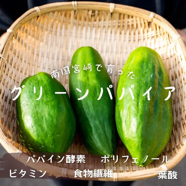 【宮崎県で育った青パパイアを1kgお届けします!】 日本のひなた、宮崎県。 ここ宮崎の太陽の日差しをたっぷりと浴びて、 元気なグリーンパパイアが今年も育っています。 栽培期間中は農薬不使用です。 ◇酵素の王様 ◇メディカルフルーツ ◇スーパーフード として今最も注目されているお野菜、グリーンパパイア。 「宮崎県新富町で育ったグリーンパパイアは、味が違う。」 「ここのが一番美味しい。」 レストランのシェフにもお墨付きをいただいているこのグリーンパパイア。 日々の食卓の一品に、今年はグリーンパパイアの料理を如何ですか? 〜グリーンパパイアのお味〜 皮は苦めですが、果実は淡白なお味です。ほんのりと甘い。 なので、グリーンパパイアって様々な料理に活用出来ます。 スムージーにしてもいいし、漬物にしてもいいし、細く切ってそのままサラダにしてもいいし、 煮てもいいし。ほかのお野菜・果物とも合わせやすいです。もちろんお肉・お魚ともGOOD。 〜メディカルフルーツ&酵素の王様&スーパーフード〜 炭水化物・脂質・タンパク質を分解する「酵素」をたっぷりと含んでいます。 そのほかにも豊富な栄養を含みます。 2022年注目ナンバーワンスーパーフードです! 〜数量〜 1kg(宮崎グリーンパパイア1~3個程度) ※出荷時期により個数は変動致します。 ※常温での郵送となります。新聞紙に包み、ビニールなどに入れて乾燥を防いだ状態で冷暗所での保存が好ましいです。暑い場合は冷蔵庫にて保存をお願いします。採れたてを発送致しますが、大凡一週間程度で消費してください。 ※写真はイメージとなります。
