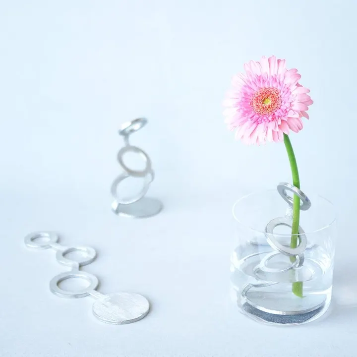 新商品! abuku(あぶく) 希少金属である錫(すず)でできた花留め(一輪挿し)です。 錫は金属なのに柔らかさを併せ持つユニークな素材で、気分に合わせ形を変えることができます。 また、錫には抗菌作用があり水を清潔に保つ効果もあるとも言われています。 手持ちのグラスや瓶と組み合わせることで、手軽に花のある暮らしを楽しむことができるアイテム。 ペンホルダーとしても活躍します。 ※商品1個の価格です。 ※商品以外のグラス等は付属いたしません。 ◎登録意匠第1795182号