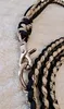 犬のカフェリード パラコード4mmコード使用 ブラックとタンのシックなリードです 小さな子でも重くないよう、小型犬用のナスカンを使用 10キロ以下の子まで使用可能 持ち手にした時、全長約125cm(多少の誤差あり) 四つ編み部分⇒約9mm(多少の誤差あり) 重さ86g(多少の誤差あり) 男の人にも派手過ぎず使っていただけると思います 汚れたら水洗い可能(洗濯機&乾燥機は不可、手洗いでお願いいたします) パラコードの性質上、焼き止めがあります 使用している間等、焼き止めが外れることがありますが ライターで外れたところを炙っていただき、ちょっとドロッ!とした時に 火傷を気を付けスプーン等で押し当てていただくとくっつきます 愛犬が噛み噛みしてしまうと切れてしまうので、噛み噛みしないよう 注意しながらのご使用お願いいたします