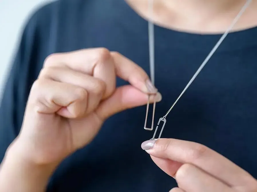 精密金属レーザーカットの技術で作られたオールサージカルステンレスのアクセサリー。 モチーフは2つのパーツで構成されていて、小さいモチーフに開けられたスリットに、大きいモチーフを通すことでネックレスがジョイントされます。手を首の後ろにまわさずに着脱することが可能です。2つの形がつながり、体の動きに合わせて揺れ動き、様々な形状に変化して、その一瞬一瞬に生まれてくる形を楽しめます。 肌に優しい医療⽤のステンレスを使⽤しています。2つのモジュールをつなぐわずかな隙間など、微細な形状に加⼯することで、最⼩限のパーツで機能を実現しています。