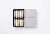 ◾️ツートンカラーの10分用ろうそく ハゼろうと米ろうのミックスセット お手軽に「瞑想時間」を楽しめるブラウンとベージュのツートンのコントラストが映える、10分ろうそくの10本のセットです。 パラフィンなど石油系原料を使うろうそくが多い中、古くから和ろうそくの原材料として使われてきたハゼろうなど、植物性100%の原料だけで作っています。 京都の老舗の箱メーカーさんにお願いして作った、落ち着いたグレーのボックスが和ろうそくの世界観を引き立てます。 <商品について> 太さと長さで時間を調整可能。「時間をデザインできる」和ろうそくの開発 開発当時、新型コロナウイルス感染症拡大による「新しい生活様式」が政府より提案され、人々の生活は劇的に変わりました。在宅ワークが増え、「おうち時間をどのように過ごすのか?」が大きなテーマでした。 「おうち時間を明るく照らす商品を作りたい」という思いを持って、コンセプトづくりに取り組む中、私たちが注目したのは、「和ろうそくは太さと長さで時間を調整できる。1時間でも2時間でも砂時計のように、その長さのろうそくを作れる」という話でした。 読経や瞑想の時間が、宗派や寺院によって異なります。和ろうそくの製造現場では、寺院ごとに異なる長さのリクエストに合わせたろうそくを作り続けてきたという話は、大変魅力的でした。 この和ろうそく文化の持つ素晴らしい価値観と技術力に魅せられた私たちは、太さや長さを調整することで指定時間に合わせたろうそくを作る技術とノウハウに着想を得て、「時間をデザイン=タイムマネジメント」するろうそくを企画開発に着手しました。 チーム内では「毎日使うとしたら1時間は長い」「毎日手軽に使えるろうそくが欲しい」という意見が出ました。 「5分単位で使えるろうそくを作りたい」「手軽なサイズのボックス入りで販売したい」という相談を重ね、試行錯誤を繰り返して最終的に、「自宅で手軽に自分時間を楽しみ演出するろうそく」として、5分、10分、20分という使いやすい時間単位にデザイン。 ハゼろう(ブラウン)と米ぬかろう(アイボリー)のカラーコントラストも楽しめる商品に仕上がりました。
