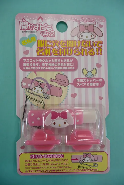 服に穴を開けない名札用留め具の定番商品の「開かずピンちゃん2」のサンリオ正式ライセンス商品です。 他のシリーズと同じくバネで留めるタイプですので、 比較的小さなお子様でもお使いいただけます。 普通のシャツから薄いスエット生地ぐらいには留めることができます。 予備のストッパー2個付いてます。 推奨年齢5歳以上 ※国内販売に限ります。