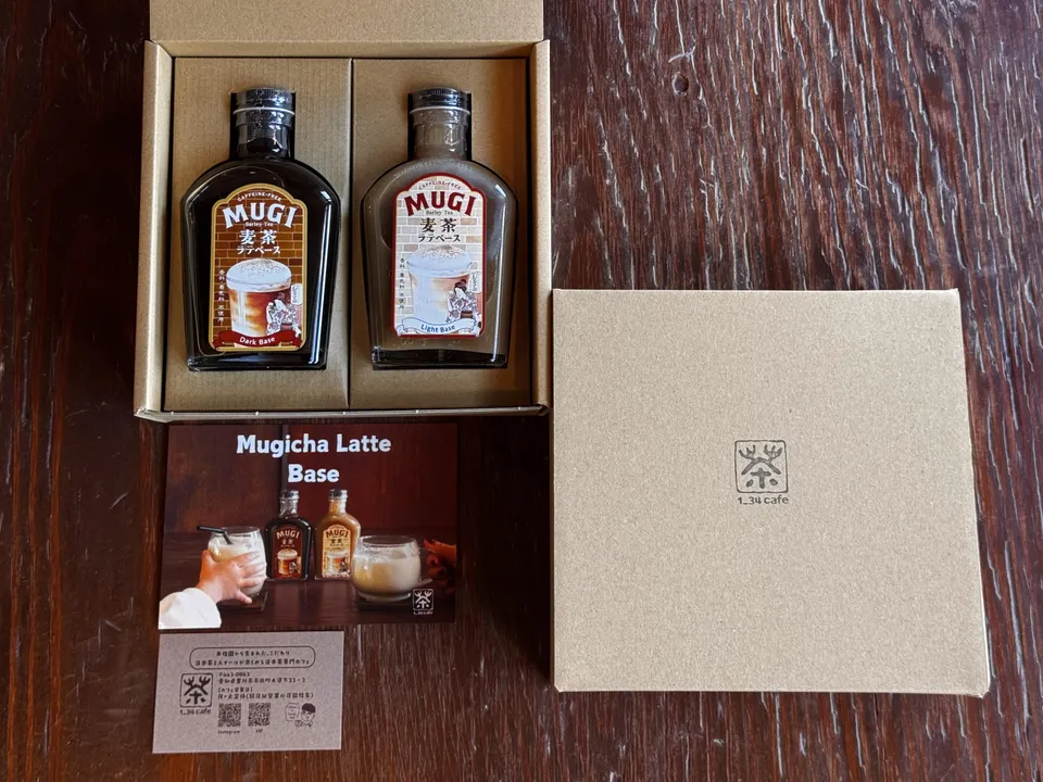 “麦茶ラテベース ギフトセット(深煎り&浅煎り)” 麦茶ラテベース 深煎り&浅煎りがセットになったギフトセットです。 【背景、コンセプト】 日本に三基しか現存しない煉瓦造りの焙煎機で職人が丹念に炒りあげた、 絶品麦茶の抽出液とグラニュー糖をブレンドした ”世界初”のノンカフェインの麦茶ラテベースです。 1_34cafeで人気のドリンクである麦茶ラテを ご家庭でも楽しめるように開発されたラテベースです。 牛乳と1:4で割るだけで美味しい麦茶ラテが出来上がります。 ・深煎り 国産六条大麦を高温2度焙煎した麦茶抽出液を使用しており、 どこか懐かしいコーヒー牛乳やポン菓子のような味わいです。 ・浅煎り 国産二条大麦を低温3度焙煎した麦茶抽出液を使用しており、 アーモンドミルクのようなまろやかな味わい。 麦茶がベースですので、無添加でノンカフェイン。 カフェインを気にされる方や、お子さま、妊婦さんでも安心して楽しめます。 【MUGIシリーズ】 現代では日常で飲まれる麦茶。 江戸時代では【麦湯】として屋台で楽しまれていました。 その様子は夏の風物詩として浮世絵や書物が多く残されています。 麦湯屋台では、麦湯の女と呼ばれる売り子が大変な人気で、 麦湯屋台を通じて江戸の庶民の飲み物として麦茶が広く普及したと伝えられています。 私たち井指製茶では創業以来麦茶の味わいにこだわり続け、 昔ながらの伝統製法の麦茶を製造し続けています。 こだわりの麦茶の新しい楽しみ方を追求し、 現代世界にも発信していきたいという想いから、 かつて江戸で麦湯を広めた麦湯の女をデザインしたパッケージに仕上げました。 こだわり麦茶の新体験をお楽しみください。 【特徴ポイント】 ・創業80年の小さな製茶会社が守り続ける、  日本に3基しか現存しない【煉瓦造りの鉄釜砂煎り焙煎機】を使用 ・世界的ノンカフェイン需要にも応えた、ラテでは珍しいノンカフェインラテベース ・無添加で安全性が高い ・海外産ではなく国内産麦を使用 ・“世界初!?”の商品でキャッチ