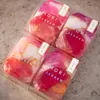 2025年12月~の冬限定の宝石石鹸です 顔、体、手どこでも好きなところに使っていただけます。 冬限定宝石石鹸 椿 カメリアシュガーの香り 赤、白、斑模様のピンクの椿の花をイメージ。 グレープフルーツ、ピーチ、バニラ、ルバーブ、アンバー、ムスクをブレンドした鮮やかな香りで 華やかで伝統的な冬のイベント気分を盛り上げます。 冬限定宝石石鹸 雪化粧 冬の針葉樹の香り 雪化粧した針葉樹をイメージ。 野いちごやパイナップル、シルバーファーやブルースプルースの針葉樹の香りに、 プルメリアやムスクの甘さも感じられる静かな香り。 椿 成分/石けん素地、グリセリン、水、PG、ソルビトール、ラウレス硫酸Na、ラウリル硫酸Na、塩化Na、クエン酸、クエン酸Na、イミノジコハク酸4Na、エチドロン酸4Na、香料、マイカ、酸化鉄、酸化チタン、赤227、黄203、ホウケイ酸(Ca/Na)、酸化スズ 雪化粧 成分/石けん素地、グリセリン、水、PG、ソルビトール、ラウレス硫酸Na、ラウリル硫酸Na、塩化Na、クエン酸、クエン酸Na、イミノジコハク酸4Na、エチドロン酸4Na、香料、マイカ、酸化鉄、酸化チタン、赤227、黄203、青1、緑3、ホウケイ酸(Ca/Na)、酸化スズ 箱サイズ 縦63mm、横45mm、高さ26mm 石鹸のサイズ 標準重量:55g 約縦60mm、横42mm、高さ23mm 手作業でカットしているので誤差があります。 ※原料の仕入れにより成分を予告なく変更することがございます ※すべて手作業で丁寧に作っておりますため、模様や色合いには一点一点個性がございます。 見本写真は可能な限り平均的なものを掲載しておりますが、実物とは多少異なる場合がございますことをご了承くださいませ。 世界に一つだけの特別な石鹸としてご愛用いただけますと幸いです。 ※経年や環境の影響で水分が蒸発し、重量が減る場合があります。 また、石鹸の収縮により表面のラップにしわが生じることがありますが、ご使用には問題ございません。 美しいうちに早めにお使いいただくか、ある程度密閉できる容器で保管すると、長くお楽しみいただけます。 ・お肌に異常が生じていないかよく注意して使用してください。お肌に合わないときは、ご使用をおやめください ・暑い所や湿気の多い所に保存すると保湿成分が水分を引き寄せ、表面に汗をかいたようになります。拭き取ってご使用ください