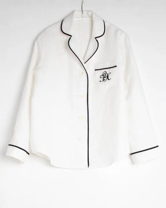 高級フレンチリネンに椿オイル加工を施し、肌触り滑らかな生地で作ったパジャマです。 皮脂に極めて近く酸化しにくい自然由来の椿オイルが繊維に配合されているので、肌に優しい保湿効果とソフトな風合いが楽しめます。 40番手のしっかりした生地は、通年着用いただけます。 ミルキーなオフホワイトの生地に、太めの黒のパイピングと同じく黒のポケット刺繍は、フレンチシックな大人っぽさを醸し出しています。 縫い合わせはすべて折伏せ縫いになっているので、引っ掛かりがなく、ほつれる心配がありません。