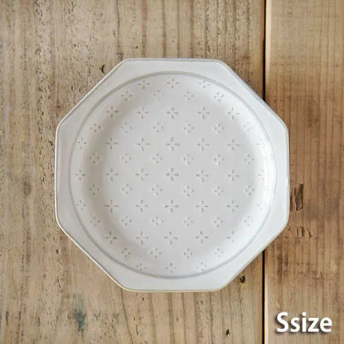 カタチがOctagon(八角形)で、個性的でおしゃれな雰囲気。お店でもあまり見かけない手の込んだデザインです。 またフラワーモチーフのエンボスが良いアクセントになっています。 約12センチと約20センチの2サイズ。用途に合わせてお選びいただけます 日常の取り分け皿として、また和のスイーツなどにも合いそうです。 磁器製で、レンジ・オーブン対応。食洗機もお使いいただけ、お手入れが簡単です。 普段使いからおもてなしまで幅広く活躍しそうです。