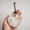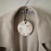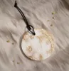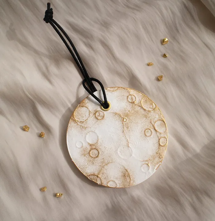 『 心ときめく、輝く月面アロマタブレット 』 月面のような、繊細なクレーター模様が特徴の吊り下げ型のアロマストーンです。 精油を滴下すると1日〜数日香り続けます。 ベッドサイドはもちろん、玄関やお手洗い、車にも、 色々な場所に置いたり吊り下げたりして、香りをお楽しみください。 【 アロマストーンとは? 】 精油を滴下するだけで香りを楽しめる芳香器。 半径1m程度の空間でふわっと優しく香ります。 電気や火を使わないためエコで、 ベッドサイド、お手洗い、玄関、車内などで気軽に使うことができます。 お手入れの必要もありません。 香りが充満しないので、 強い香りが苦手な方にもおすすめです。 また、香りは1日〜数日程度で消えてゆきます。 そのため1つのアロマストーンで色々な香りをお楽しみいただけます。 【 SIZE 】 アロマストーン:直径7cm×厚み1cm ひもの長さ:約8cm 【 DETAIL 】 繊細な月のクレーター模様がキラキラと輝くアロマストーン。 吊り下げて揺れるたびゴールドカラーが光って、心をときめかせてくれます。 まんまるで程よい厚みのある平面のデザインは、 クローゼットにかけても場所を取りません。 ひとつひとつ手作業でお作りしています。 ゴールドの色のつき具合など、できるだけ同じように仕上げますが、 手塗りのため毎回仕上がりが異なります。 ※裏側は少し粉っぽいので、粉が衣服などにつかないようお気をつけください。 ※精油が色移りするため、裏側に滴下することをお勧めいたします。 【 おすすめの使い方 】 ✔︎ベッドサイドに置いて、睡眠のお供に ✔︎カーアクセサリー、お手洗い、玄関などにかけて芳香剤として ✔︎お気に入りのスペースに置いて、インテリア小物のひとつとして
