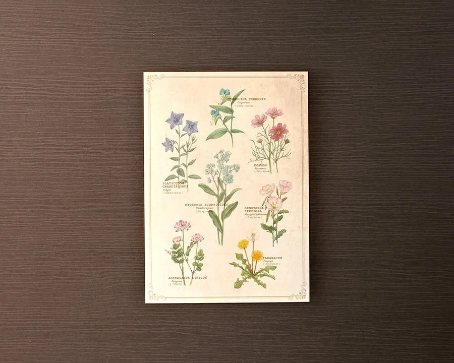 丁寧に描いた優しいタッチの絵柄に学名や科目などを添え、図鑑のような雰囲気を楽しめるデザインに仕上げています。 グリーティングカードや季節のご挨拶などにもおすすめです。 そのままインテリアとして飾っても楽しめます。 *ポストカードには繊細な風合いで優しい手ざわりの紙を使用しています。ナチュラルで品があり、紙本来の質感を楽しむことができます。 ◆バリエーションは下記の11種類ございます 《モチーフ:ハーブ7種ミックス》 ローズマリー、レモンバーム、ジャーマンカモミール、バタフライピー、スイートバジル、コモンタイム、イングリッシュラベンダー 《モチーフ:野の花 7種ミックス》 レンゲソウ、タンポポ、ヒルザキツキミソウ、忘れな草、ツユクサ、桔梗、コスモス 《モチーフ:森の動物7種ミックス》 モリフクロウ、ハイイロオオカミ、アナウサギ、モモンガ、シマリス、ツキノワグマ、ハリネズミ 《モチーフ:きのこ 9種ミックス》 キララタケ、ドクベニタケ、ハナオチバタケ、ヒメムラサキシメジ、ベニテングタケ、テングタケ、タマゴタケ、ワカクサタケ、ソライロタケ 《モチーフ:野鳥 9種ミックス》 ウソ、カワセミ、キビタキ、ジョウビタキ、キクイタダキ、メジロ、ルリビタキ、シジュウカラ、ヤイロチョウ 《モチーフ:海の生き物 8種ミックス》 シャチ、カマイルカ、ミズクラゲ、ハンドウイルカ、ジンベエザメ、ザトウクジラ、コウテイペンギン、アオウミガメ 《モチーフ:高山植物7種ミックス》 コマクサ、チョウノスケソウ、トウヤクリンドウ、ハクサンコザクラ、ミヤマオダマキ、ウサギギク、チシマギキョウ 《モチーフ:木の実 7種ミックス》 クチナシ、ナナカマド、カラマツ(松ぼっくり)、ラズベリー、ミツバアケビ、ノブドウ、コナラ(どんぐり) 《モチーフ:やさい 9種ミックス》 トマト、オクラ、ニンジン、レタス、レンコン、トウモロコシ、ナス、カボチャ、ハツカダイコン 《モチーフ:くだもの 9種ミックス》 イチジク、バナナ、モモ、ナシ、イチゴ、ブドウ、パイナップル、キウイフルーツ、リンゴ 《モチーフ:サバンナの動物6種ミックス》 グラントシマウマ、キリン、ヨーロッパフラミンゴ、チーター、ライオン、アフリカゾウ 《内容量》1枚 - - - Retronome〔レトロノーム〕シリーズ - - - 花や植物、生き物たちのありのままの姿をデフォルメせずに優しいタッチで丁寧に描き、図鑑風のデザインに仕上げたシリーズです。 ちょっとしたプレゼントやお土産に、男女問わず幅広い年齢の方にも興味を持っていただいています。 - - - - - - - - - - - - - - - - - - - - - - - - - - - - - - - - - - - - -
