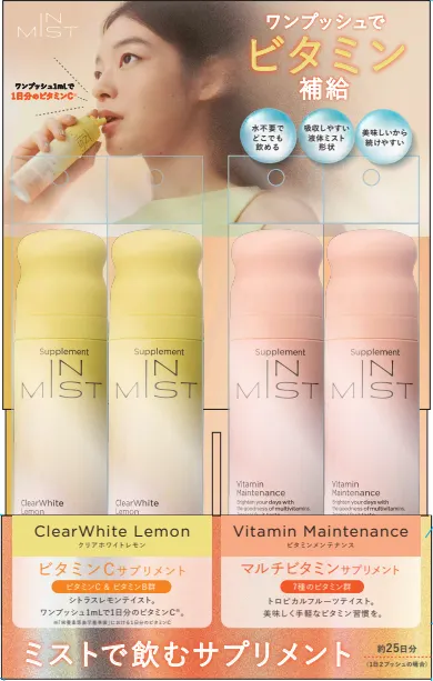 ミストで飲む美容サプリメント「IN MIST」。高品質なビタミンを、どこでも手軽にワンプッシュするだけ。手軽さと美味しさで“継続できる”美容習慣をお届けします。