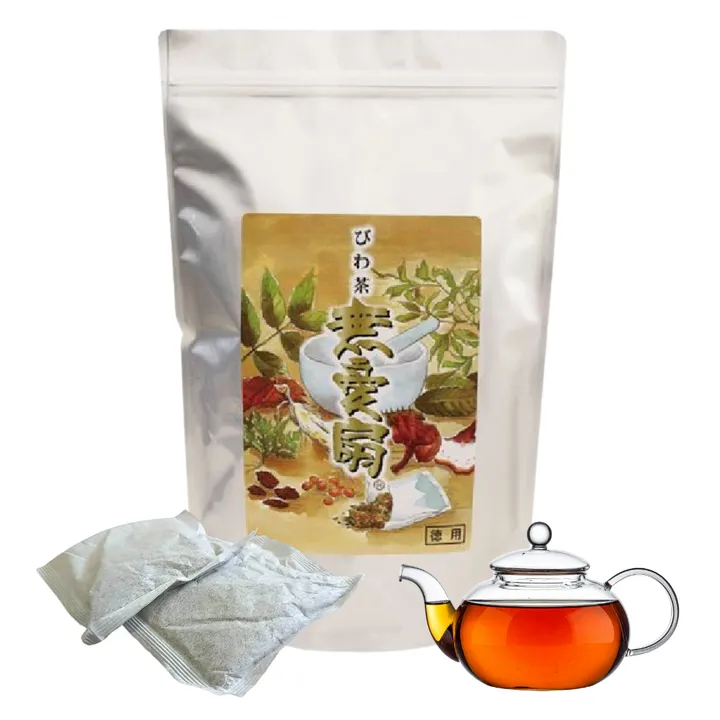 10種類の天然素材をブレンドした、まろやかな味と上品な香りをしたお茶です。 自然界の陰陽論に基づいて10種類の原材料を配合し、体の内側からバランスを整え、健康維持をはかるため誕生したのが、びわ茶「無憂扇」です。 約2,500年前に誕生したびわの葉を煎じたお茶に、はと麦、はぶ茶、霊芝、あまちゃづる、ヨモギ、枸杞(根皮を含まず)、柿葉、タラ木(樹皮、根皮を含まず)、オタネニンジン、計10種類の原材料をブレンドしました。 びわの葉を使った療法は、長い歴史に培われた自然療法です。古来より病める人々には、びわの葉が用いられてきました。 インドの古い教典にもびわの木を「大薬王樹」、その葉を「無憂扇」と記されており、伝承医術として早いうちから日本に定着した古い療法です。 びわの葉には、様々な有効成分が含まれています。飲み方はお好みによって様々です。 お茶として愛飲するほか、はちみつレモン、焼酎などとブレンドしても美味しく頂けます。 まろやかな味と上品な香りに仕上げたびわ茶無憂扇をご家庭でお楽しみください。 お茶ガラは、植木などの肥料にも使ったり、お風呂に入れるなど、エコでヘルシーな使い方が出来ます。 (プレゼント、贈り物、ギフトにもおすすめ) ご家庭用にはもちろん、贈り物にも喜んで頂ける「びわ茶無憂扇」です。美味しいギフトはもちろん、体に良いギフトならもっと印象深いはずです。思いやりが詰まった自然の恵みたっぷりのびわ茶無憂扇があなたに元気を届けます。