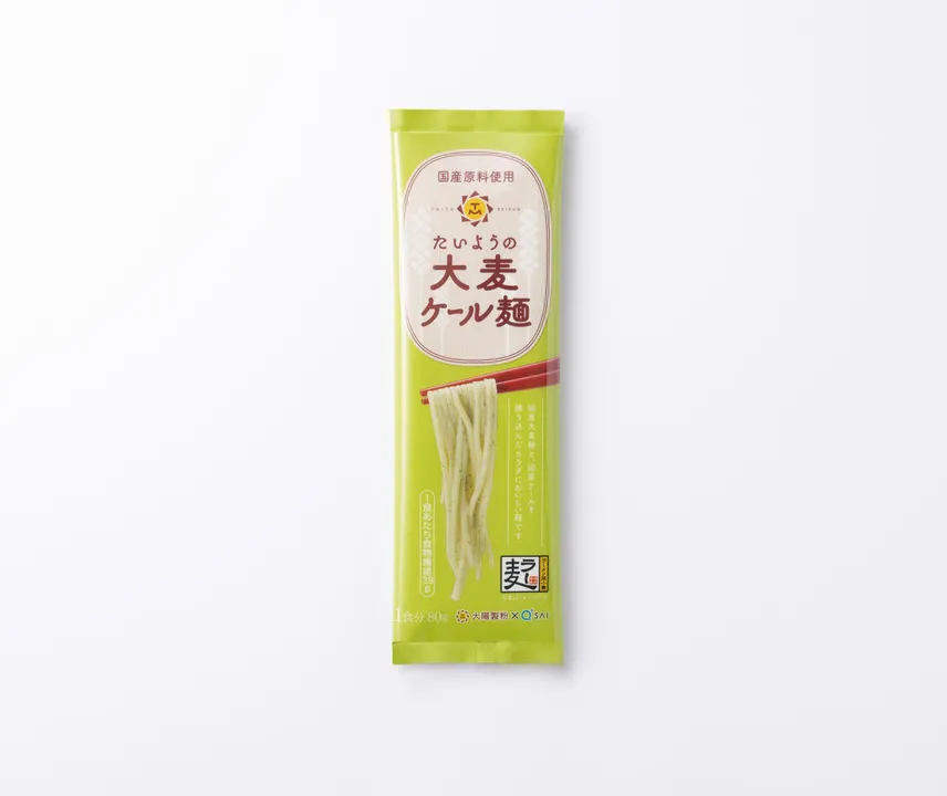 「たいようの大麦ケール麺」は福岡県産小麦「ラー麦」をベースに食物繊維が豊富な「大麦粉」と栄養豊富な野菜「ケール」を麺に練りこんだからだに美味しい麺です。