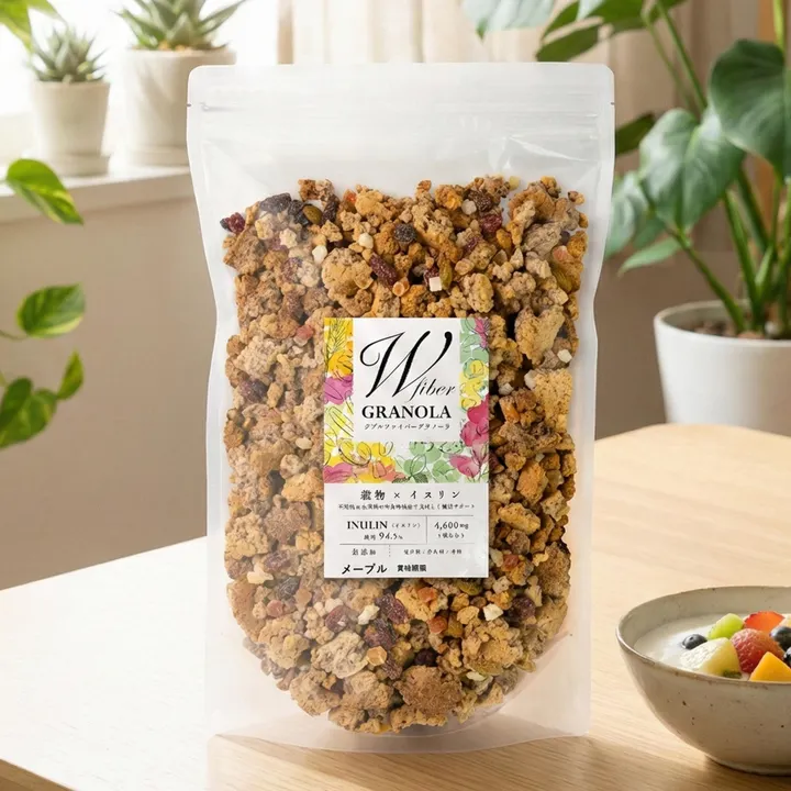 1) この商品で何ができるのか/どんな商品なのか(製品概要) 区分:シリアル加工食品(グラノーラ) コンセプト: 国産生おから(不溶性食物繊維・たんぱく)+オートミール(β-グルカン)に、高純度イヌリン(水溶性/原料純度目安94.7%)を配合したW食物繊維設計。 メープル風味、無添加設計(保存料・着色料・香料不使用)。 ✅【W(ダブル)の食物繊維で、理想のモーニングルーティン。最高品質イヌリンを贅沢に練り込んだ「罪悪感ゼロ」のグラノーラ】 モンドセレクション5年連続最高金賞受賞の「高純度イヌリン」を、国産生おからと有機オートミールの生地にたっぷりと練り込みました。 「スッキリした毎日を送りたい」「でも美味しい朝食は諦めたくない」。 そんな願いを叶えるために、素材の質と配合バランスを極限まで追求した、美容と健康のためのプレミアムグラノーラです。 ✅【不溶性×水溶性のシナジー。内側から「出す・整える」を一度に】 水を吸って大きく膨らみ、内側をお掃除する「不溶性食物繊維(おから・オートミール)」と、善玉菌のエサとなり内側の環境を整える「水溶性食物繊維(イヌリン)」。この2つの食物繊維が互いの働きをサポートし、重苦しい毎日からの解放を助けます。特にイヌリンは、善玉菌のエサになる効率が100%と言われる最高スペックの食物繊維です。 ✅【厳選された「日本一」の素材たち。妥協のない原材料選び】 ● 国産生おから:全国豆腐フェスティバル1位に輝いた「上杉食品」の生おからを使用。 ● 有機オートミール:OTCO認定を受けた農薬・化学肥料不使用の高品質な素材。 ● こだわり素材:甜菜糖、バニラビーンズ、ヒマラヤ岩塩、ココナッツオイルを使用。 さらに6種のドライフルーツとナッツをどっさり配合し、ひと口ごとに変わる豊かな味わいと食感を楽しめます。 ✅【日本マタニティフード協会認定。グルテンフリー&無添加の徹底した安心感】 本品は「一般社団法人日本マタニティフード協会」の認定商品です。 保存料・着色料・香料は一切不使用。さらにグルテンフリー、ヴィーガン対応、糖質40%カット(※)を実現しました。トランス脂肪酸の懸念がある油も使用していないため、妊産婦さんはもちろん、お子様からご高齢の方まで、ご家族全員の健康的な朝の習慣として安心してお召し上がりいただけます。 (※一般的なグラノーラと比較) ✅【現役医師も推奨。忙しい朝に「賢く補う」新習慣】 予防医学・美容医療の山下真理子医師が推奨。 「Wファイバーグラノーラは、不溶性と水溶性の食物繊維を理想的なバランスで摂取できる、非常に優れた食品です。特に100%善玉菌のエサになる高純度イヌリンを配合している点が素晴らしく、効率的に内側のコンディションを整えたい方、スマートな毎日を維持したい方に心からお薦めします。」 ✅【お召し上がり方】 牛乳、豆乳やアーモンドミルクをかけて。また、そのままポリポリと「噛むおやつ」としても満足感たっぷりです。不足しがちな鉄分、カルシウム、ミネラル、ビタミンB群もこれ一食でしっかりサポート。忙しい朝、手軽に美味しく「最高の体調」を整えましょう。 2)どうしてこの商品が誕生したのか(開発背景) 朝食や間食で食物繊維摂取(不溶性+水溶性)を一度に行いたいという需要に対応。 国産生おから×オートミールで食感と栄養バランスを両立し、高純度イヌリンで水溶性繊維を強化。 3) 使うシーンの明示/導入メリット 想定販路:ドラッグストア、自然食品店、GMS、EC、カフェ物販 など 棚割提案:糖質配慮/グルテンフリー/食物繊維強化/プラントベース 導入メリット: W食物繊維・**原料訴求(国産おから/OTCOオーツ/高純度イヌリン)**で比較軸が明確 無添加(保存・着色・香料不使用)、ココナッツオイル使用など安心感の高い処方 ナッツ&フルーツで食味・見栄えが良く、リピート提案が容易 4) お勧めの使い方 1食の目安:40–50g(牛乳、豆乳、ヨーグルト、植物性ミルク等と一緒に) 活用例:朝食の主食置換/間食の置き換え/サラダのトッピング/アイス・パフェのクラッシュ利用 注意例:食物繊維豊富なため、初期は少量から。体質・体調によりお腹がゆるくなる場合は量を調整。 5) どんな人におすすめか 食物繊維の摂取を強化したい層 グルテンフリーや無添加志向の層 朝食の栄養バランスや間食の質を高めたい層 ※個人差があり、医薬的効能の断定は不可。