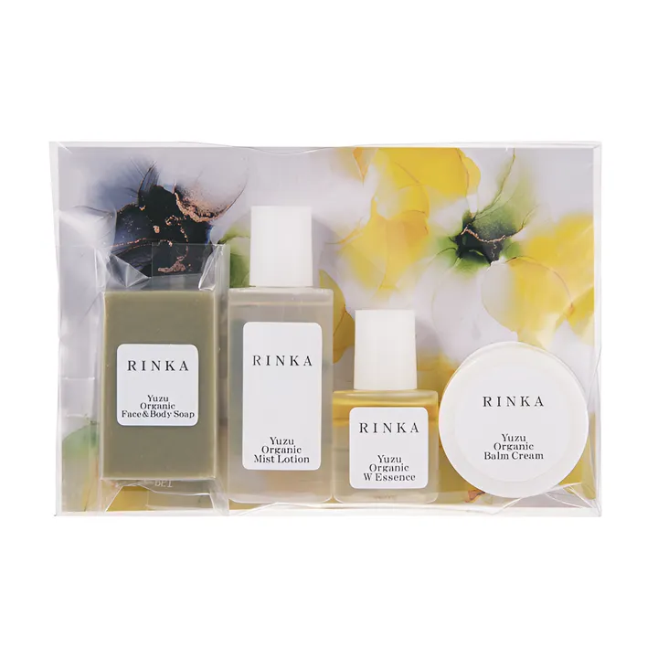 RINKAとは 肌にやさしいエイジングケア*シリーズで、基礎肌力アップを目指します。 植物療法に基づき植物の持つ力を最大限に活かした本物のオーガニックスキンケアです。 *年齢に応じたお手入れ ●完全無添加にこだわった国産オーガニックスキンケア ●天然成分100% ●配合植物はすべてオーガニック原料 ●キャリーオーバー(溶剤)にも石油・化学合成成分は一切使用せず蒸留・圧搾・加熱にて抽出 ●アルコールフリー ●グリセリンフリー ※日本オーガニックコスメ協会、リアルオーガニック・ナチュラル🄬の推奨品です。 【こんな肌悩みの方におすすめ】 ✔ 乾燥しがちな方 ✔ 小ジワが気になる ✔ 毛穴の開きが気になる ✔ 肌がくすんでいる 【アップサイクル原料 “もったいない”から“活かしたい”】 有機の里と言われ、オーガニックビレッジ宣言をしている 埼玉県小川町の自然栽培の柚子をアップサイクルしています。 柚子を含めた柑橘系の果樹は、「代々(橙)家が栄える」と言われて縁起が良く、昔から庭先に植えて料理やゆず湯などで活用していました。しかし、柚子の木にはトゲがあり実が採りにくく、収穫せずに自然に落ちて土に還る状態でした。 そこで、“もったいないから活かしたい”という思いと、柚子の保湿・抗酸化・収れん作用などの力に着目。 RINKAは無農薬・無肥料で育った柚子の皮・実・種を余すことなくハーバルウォーター・エキス・オイルにし、オーガニックスキンケアに活用しています。 【柚子の美肌効果】 柚子をまるごと使ったユズ成分には、収れん・保湿・血行促進などの効果があります。 ■クエン酸 柚子の主成分で収れん(肌の引き締め)作用を持ち、キメを整えることで肌をきれいに見せてくれます。 ■ビタミンC ビタミンCの含有量は柑橘類の中でもNo. 1とも言われ、コラーゲン生成促進作用があり、ふっくらとした保湿力の高い肌へと導き、肌のハリ、ツヤが良くなります。 ■ペクチン 多糖類の一種で、表皮をなめらかにして保湿作用があります。 ■ヘスペリジン ビタミンPとも呼ばれるポリフェノールの一種で、血管を強化することで血行が良くなり、ターンオーバーの促進や肌のツヤ改善に効果があります。また、高い抗酸化作用があるため、肌老化防止にも役立ちます。 10日分のお試しセットで、テクスチャーや使い心地をご確認いただいたり、旅行用としてご利用いただけます。 【内容量】 10日分 ユズ オーガニック フェイス&ボディソープ 17g ユズ オーガニック ミストローション 20mL ユズ オーガニック ダブルエッセンス 10mL ユズ オーガニック バームクリーム 8g