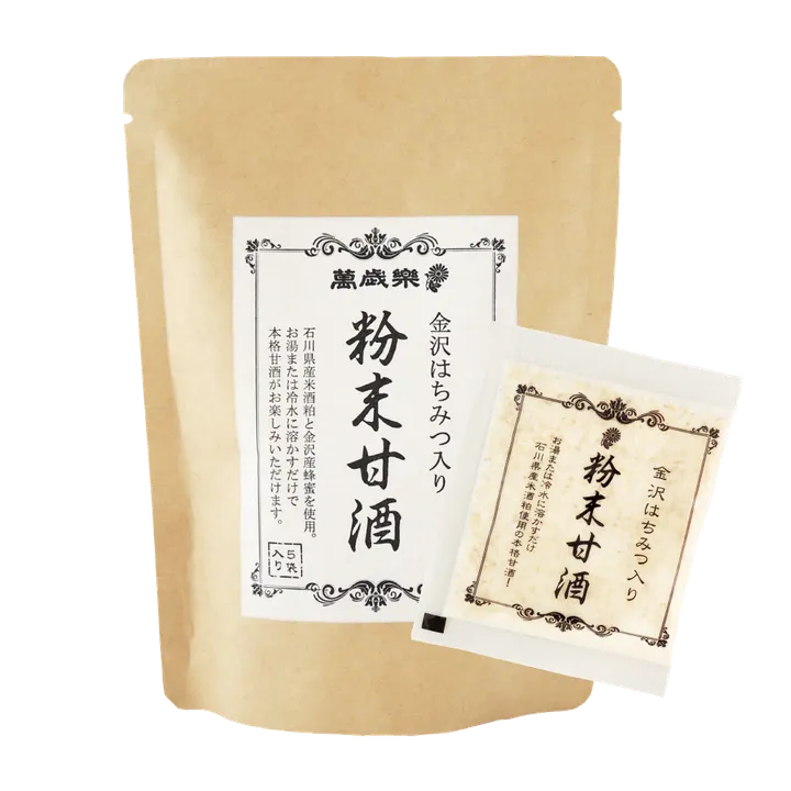 創業享保元年、白山信仰の門前町鶴来の地で二百九十余年の歴史を刻む清酒「萬歳楽」。そのこだわりの石川県産米で醸した清酒粕をぜいたくに使い、金沢・自社養蜂場産のはちみつ、高知産の生姜を合わせ、飲みやすく仕上げました。水にも溶けやすい粉末で、1杯ずつ個包装になっているので、お手軽に本格派の甘酒がお楽しみ頂けます。 甘酒は、栄養点滴にも匹敵する栄養価の高さから『飲む点滴』とも呼ばれます。ブドウ糖、アミノ酸、ビタミンB群、食物繊維やオリゴ糖などを豊富に含み、近年は美容への効果も期待されています。 ●お召し上がり方 粉末甘酒を1袋コップに入れ、約90mlのお湯で溶かし、よくかき混ぜてお召し上がり下さい。 冷やしても美味しくお召し上がりいただけます。 ※お好みによりお湯や冷水の量を加減してください。 【ご利用シーン】 ウェルカムドリンク