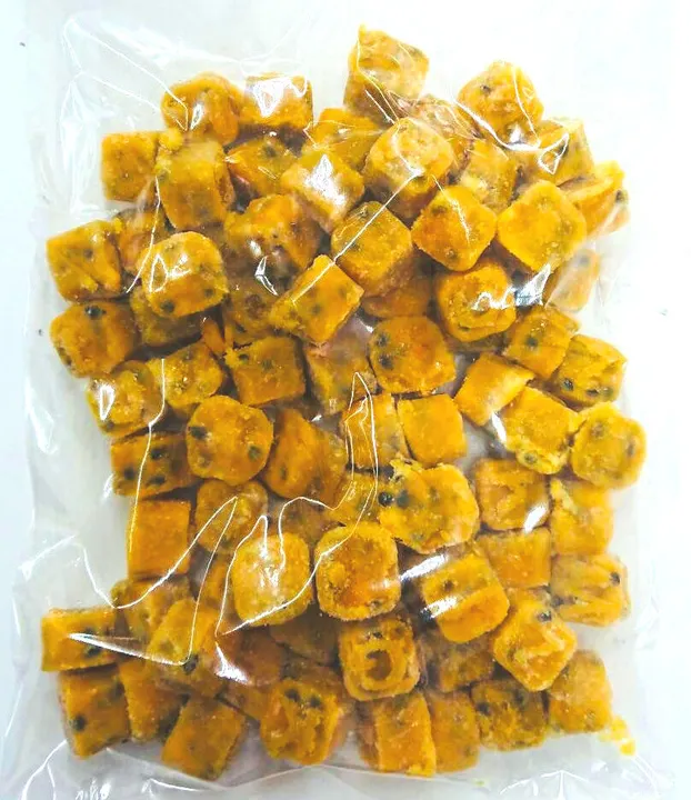 果物のプロの目で厳選した冷凍フルーツ パッションフルーツ果汁(キューブ)の短い旬の美味を凍らせました。ベトナム産です。 パッションフルーツの皮を剥き、パッションフルーツ果汁使いやすいサイズに素早く固め、急速冷凍していますので、果実本来の風味と味覚が楽しめます。 ひとつづつ日本国内の弊社工場内で再検品、リパックしています。 スムージー、フルーツインティー。かき氷、フルーツウォーターの材料 として、ヨーグルトの材料として、フルーツカクテル用のフルーツとして、冷凍フルーツは、注目を浴びています。