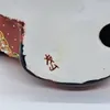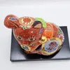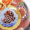 九谷焼の特徴は、「呉須(ごす)」とよばれる藍青色で線描きし、「五彩」とよばれる、赤・黄・緑・紫・紺青の5色での絵の具を厚く盛り上げて塗る彩法です。