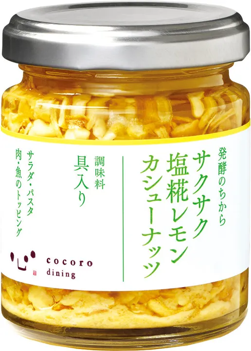 【サクサク塩糀レモンカシューナッツ】90gびん×1 新食感調味料に新味種登場! ※賞味期限まで残り6カ月以上の商品を発送します。 瀬戸内レモンがさわやかに香る、サックサクの新食感調味料 フリーズドライの塩糀をベースに、ドライオニオン、ローストカシューナッツを加えたサクサク食感のトッピング調味料です。 塩糀のうま味と、瀬戸内産レモンとリンゴ酢のさわやかな酸味が料理の味を引き立てます。 糀の力で米の甘味、旨味を引き出した塩糀。味のアクセントに。 瀬戸内レモンの皮、果汁、パウダーでさわやかなレモン感に。 素焼きのカシューナッツがたっぷり入って、カリカリ食感に。 栄養成分表示 大さじ1杯(約15g)あたり/エネルギー90kcal、たんぱく質0.8g、脂質7.7g(飽和脂肪酸0.7g)、炭水化物4.8g(糖質3.6g、食物繊維1.2g)、食塩相当量0.7g 原材料名 なたね油(国内製造)、ローストカシューナッツ、ドライオニオン、フリーズドライ塩糀(塩糀、食塩、難消化性デキストリン)、砂糖、レモン果汁パウダー、食塩、酵母エキス、レモン果皮、レモン果汁、りんご酢/加工でん粉、酸化防止剤(ビタミンE) アレルギー物質(28品目) カシューナッツ、りんご 商品の輸送中の揺れにより、油が白くにごったり中の具材が沈むことがありますが、品質には問題ございません。 黒い粒がみられることがありますが、原料の農産物由来のものです。