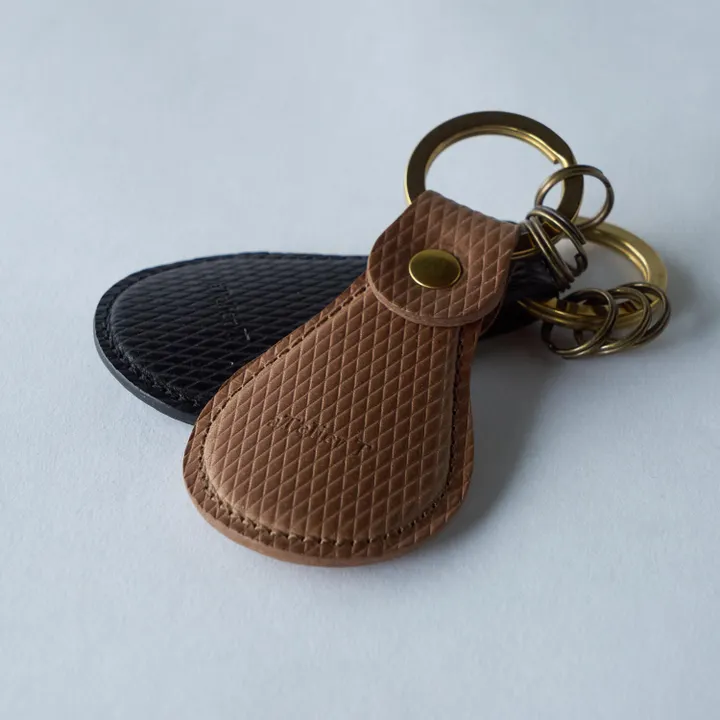 ■くせになるしなりぐあい■ 中に特殊な方法を用いて硬くしたタンニンなめしの革を使い、表革で挟み込んでいます。 ほどよい硬さでしなるため、金属のみで作られた靴ベラとはまた違った使い心地でお楽しみいただけます。 真鍮金具を使っており、革とともに使うほどに経年変化特有のアンティークな雰囲気が出てきます。 ■革素材について ひし型の模様が特徴であり、現在では幻の革と呼ばれている「ロシアンカーフ(※)」を、姫路のタンナーさん(製革業者)に再現して作っていただいたオリジナルのレザーです。 時を経るごとに風合いが出るように、タンニンとオイルを入れてもらっております。オイルをたくさん含んでいるので、使用による爪の跡や軽い当たりキズ(スレ)は、手でこすっていただきますと馴染んでわかりにくくなります。また、ひし形の模様があることで目立ちにくくもなっております。 ※ロシアンカーフとは、1700年代の帝政ロシアにおいて生産されていた高級皮革。1900年代前半のロシア革命時に、なめし製法の詳細が失伝してしまい、現在ではほとんど流通しておらず、希少性が高い素材です。当作品の使用している革は、そのロシアンカーフの表情を再現していただいております。 ■素材 表革・裏革:牛革(姫路産) 芯材:牛床革 リング:真鍮生地 小リング(3個):真鍮メッキ ■サイズ (リング含む全長) 高さ 約11cm X 幅 約5cm ========================================================= ● 天然素材である本革を使用しています。シワ・傷・色ムラ・トラ等がある場合がございますが、本革が本来持っている特性ですのでご了承ください。 ● カラーはロットにより多少色が異なる場合がございます。掲載する写真映りや閲覧を頂く端末によっても色の見え方が異なることがあるかもしれませんがご了承ください。 ● 水に濡れますとシミの原因になります。摩擦や水濡れにより衣類との摩擦で色移りしますのでご注意下さい。また保管される際は風通しのよい場所でお願いいたします。色移りしやすいものとは避けてください。 ● 真鍮金具は経年変化をしやすく、色味や光沢などの個体差が大きい素材です。金具取り付け前はひとつひとつを検品をして、手作業で磨きこんでシミやくすみを取り除き、できるだけ個体差が少なくなるよう努めておりますが、それでも多少色味や光沢感などがロットにより異なる可能性があることご了承ください。 =========================================================
