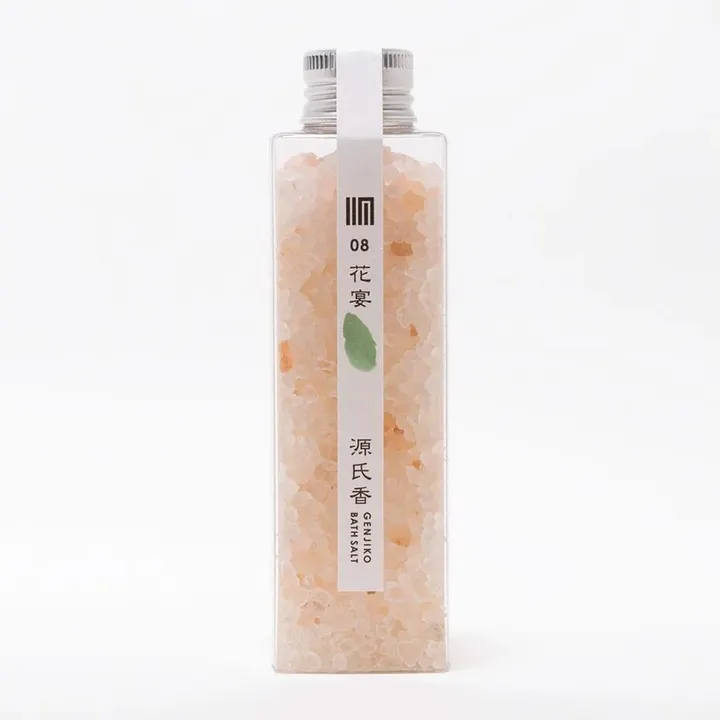 【源氏香アロマバスソルトシリーズ 〜源氏物語の5人の姫君をイメージした香り〜】 「源氏香」とは江戸時代に大流行した組香遊戯です。源氏香アロマバスソルトシリーズでは名付けの元となった「源氏物語」に登場する5人の姫君をイメージし、アロマバスソルトで表現しました。 【08 花宴(朧月夜) PASSION 魅惑的で華やかな香り】 花宴は光源氏二十歳の折、朧月夜という女性と出逢った宮中での桜花の宴という行事を指す言葉です。朧月夜はとても高貴な生まれの女性ですが、当世風美人で才気もあり源氏が夢中になってしまう程の華やかさがありました。彼女は朱雀帝(源氏の兄)の寵愛を受けながらも源氏との恋に生きました。彼女は自分の恋心に正直であり、男性の心をも奪ってしまう程の華やかな魅力に満ち溢れた女性です。 商品特徴 天然ミネラルを豊富に含んだヒマラヤ岩塩とブレンド精油を使用。肌を引き締めキメを整える作用がある他、ゆっくり汗を排出する半身浴にもおすすめです。 ご使用方法 180gボトル:浴槽約180Lに対し本製品を20〜40g程度投入しよくかき混ぜてからご入浴下さい。 30g包:浴槽約180Lに対し1袋を投入して、よくかき混ぜてからご入浴下さい。 成分 塩化Na(ミネラル塩)、香料(グレープフルーツピンク/ビターオレンジ/イランイラン1st/ジャスミンアブソリュート/バルサムペルー)