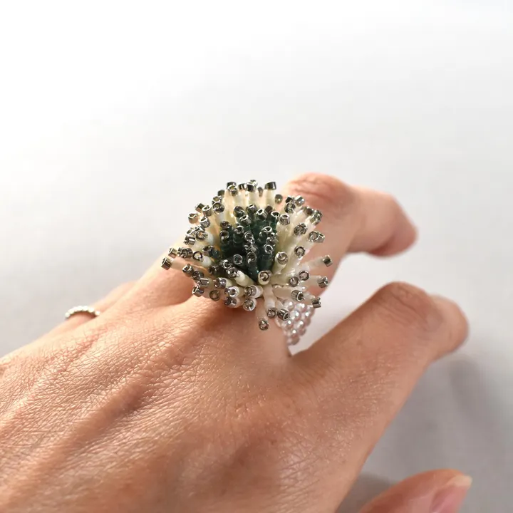 小さい頃のお姫さまはみな シロツメクサの王冠を身に着けていました 白い花をあつめて ひとつづつ編み込むのに夢中で 気が付いた時には夕暮れが訪れていることが よくありました material ガラスビーズ、銀糸、フェルト、ゴム *シルバービーズはパラジウムッキ加工を施したものを使用しております size モチーフ約Φ20x13mm、指まわりフリー(約9号〜) *伸縮性のあるゴムを使用しているためフリーサイズでお着用いただけます weight 約5.12g *CACICOの商品は全て1点1点制作しているため、個体差がございます。商品写真と差がある場合がございます。ご了承の上、ご購入ください。 *金属アレルギーの方はご使用をお控えください *受注生産のため、ご注文確定後1週間〜10日以内に商品を発送いたします