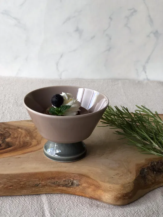 脚のある形状に、スモーキーな色合いと表面の艶がデザートを引き立てる器です。デザートボウルは、プリンやアイスを盛り付けやすいサイズ。ラップがピッタリと付くので、冷蔵庫での保存するのも便利なデザートカップです。