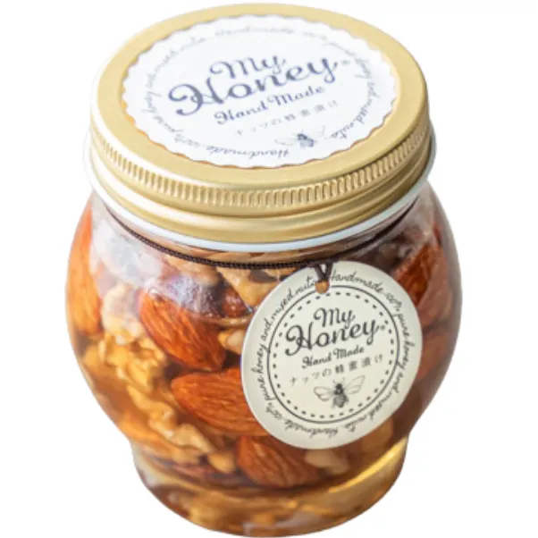 【価格改定のご案内】 この度、恐縮ながら価格改定についてお知らせ申し上げます。 ●2026年4月1日~ ●新価格2,028円(税抜)、2,190円(税込)に変更となります。 このたび各種原材料や輸入コストが高騰し、業務改善や調達方法の見直しなど、可能な限り内部努力による吸収を続けてまいりましたが、製造全体のコスト上昇が避けられない状態となり、誠に不本意ではございますが、商品価格を改定させて頂くこととなりました。 今後も品質向上および生はちみつを使用した新商品の開発に、より一層取り組んでまいる所存でござます。 引き続き変わらぬご愛顧を賜りますよう、心よりお願い申し上げます。 ----------------------------------------------------------------------------------------------------------------------------- ハチミツとナッツの栄養を一度においしく! 稀少なハンガリー産アカシア蜂蜜にナッツを漬け込んだスーパーフード モデルの間食としても注目されるミネラル豊富なナッツをハンガリー産の非加熱アカシア蜂蜜で漬け込みました。 ナッツとハチミツの栄養が一度に摂れるMYHONEY(マイハニー)の「ナッツの蜂蜜漬け」は、「FOODEX JAPAN 美食女子グランプリ」にて金賞を受賞したスーパーフードです。 ナッツは気になる年齢、美容の面でも注目されており、今やヘルシーな食材として広く知られるようになりました。 美容と健康、ダイエットに。 そして大切なあの人へのギフトに自信を持ってオススメします。 【低GIで健康に】 「GI値」は食べたときの血糖値の上がりやすさを数値化したものです。 GI値が高い食品ほど糖質が急激に吸収され、身体への負担が大きいと言われています。 ナッツを漬け込んでいるMYHONEYの生はちみつ(アカシアハニー)は「低GI食品」に分類され、身体に負担が少ない食品として注目されています。 【世界中から厳選したナッツを使用】 ナッツはアーモンド、カシューナッツ、くるみ、マカダミアナッツを使用。 アメリカをはじめとした世界中から厳選した良品を、焙煎職人が手作業で仕込んでいます。 アーモンド(ビタミンE・ポリフェノール):ナッツの中でも栄養素がトップクラス。ビタミンEが豊富です。 【お召し上がり方】 そのまま食べるのも美味しいですが、朝食のヨーグルトや、トーストやパンケーキに添えたり、ワインなどお酒のおつまみ、チーズに乗せてパーティーに、お料理や手作りスイーツなど、使い道はアイデア次第で無限に広がります。