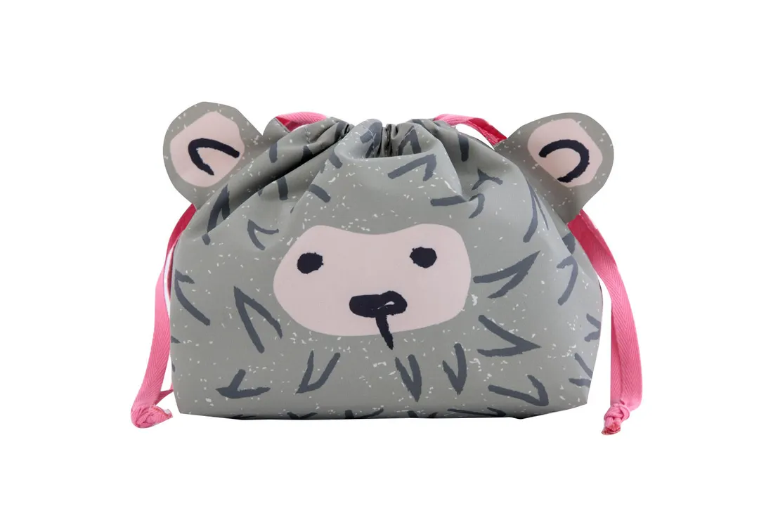 モモンガシリーズの耳付き巾着が登場しました! 薄手素材の保冷保温裏地付きです。 底面にはちゃんと手とロゴがプリントされています。 後ろ姿も見てほしい!毎回ランチのおともに連れてってください!