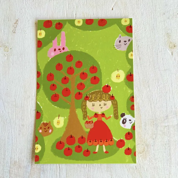 apple princessりんごちゃんは、りんごの大好きな普通の女子・9歳。 ともだちのりすっこ、うさちゃんと季節を巡る、ポストカード。 種類は全部で12種類。 飾ったら、インテリアにもなる「作品集」のようなポストカード。 絵本のようなかわいい絵柄は、年代問わず、ちびっこのいるファミリーから おばあちゃん世代まで愛されています。 サイズ/縦150mm×横100m 上質紙 オフセット印刷 *PCモニターやスマホ画面と色が違って見えることがありますので、 ご了承お願いいたします。