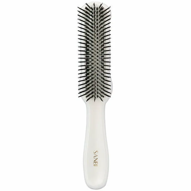 豚毛とナイロンナイロンと豚毛を交互に植毛したブラッシングブラシです。 頭皮に適度な刺激をあたえ皮脂の分泌を促すのに適した長いナイロンピンと、髪の表面にツヤを出す短い豚毛が交互に植毛されている(ペア植毛と呼んでいます)ことにより、効率的にブラッシングと髪のセットが行えるブラシです。細めのナイロンを使用し、段差をつけて植毛することで髪に絡まりにくく、毛の先端を丸くすることで頭皮のあたりが良くなるように設計されています。