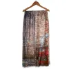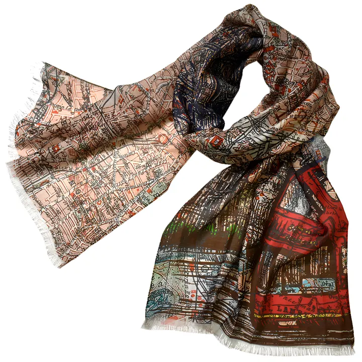 薄手のレーヨン素材にロンドンやパリの風景、地図などをアレンジしてプリントしたストール。 エッフェル塔やその周辺のトゥール・エッフェル庭園の緑。ロンドンのビッグベンや市内を 縦横無尽に走るダブルデッカーの赤色などの効かし色が特徴的です。古さと新しさの両方を合わ せ持つデザインが新鮮。巻いて楽しい、見て楽しい1枚です。 素材は吸湿性放湿性に優れとろみのある触感が特徴のレーヨンです。 巻く人の年代を選ばない柄なので、エイジレスでお召頂けます。