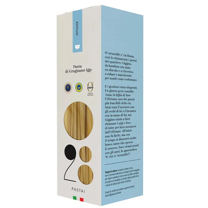 【イタリア版ミシュランGambero Rossoガンベロ・ロッソ TOPイタリアンフード受賞 プロが認める逸品】 ◎イタリア版ミシュランとも称されるレストラン格付け「Gambero Rosso(ガンベロ・ロッソ)」にて、栄誉ある「TOP ITALIAN FOOD賞」を受賞。 その味は、イタリア国内の著名なガストロノミーでも採用されており、プロからも高く評価される折り紙付きの逸品です。 ◎使用する素材はすべて無農薬。さらに、パスタの聖地グラニャーノ産で、PGI(地理的表示保護)認定を受けた品質です。 ◎各パッケージには、ブランド名の由来となった28人のパスタ職人たちの似顔絵とエピソードが描かれており、物語性あふれるデザインが魅力。  洗練されたビジュアルとストーリーが融合したおしゃれな仕上がりで、ギフトにもぴったりの逸品です。 ◎原産国 イタリア ◎ソースがよく絡むブロンズダイス製のパスタを使用。きしめんのような平たいパスタです。ポルチーニなどキノコ系、クリーム系のパスタと相性抜群です。 グラニャーノパスタのIGP認定を受けたもちもちで良質なパスタ 職人の手による伝統的なパスタを製造している小さなパスタ工場、28PASTAIは1934年にイタリア、グラニャーノの渓谷に誕生しました。 農薬不使用のイタリア産デュラム小麦を使用して作られたパスタは、イタリアの美食家たちをも納得させる、深い味わいを誇ります。