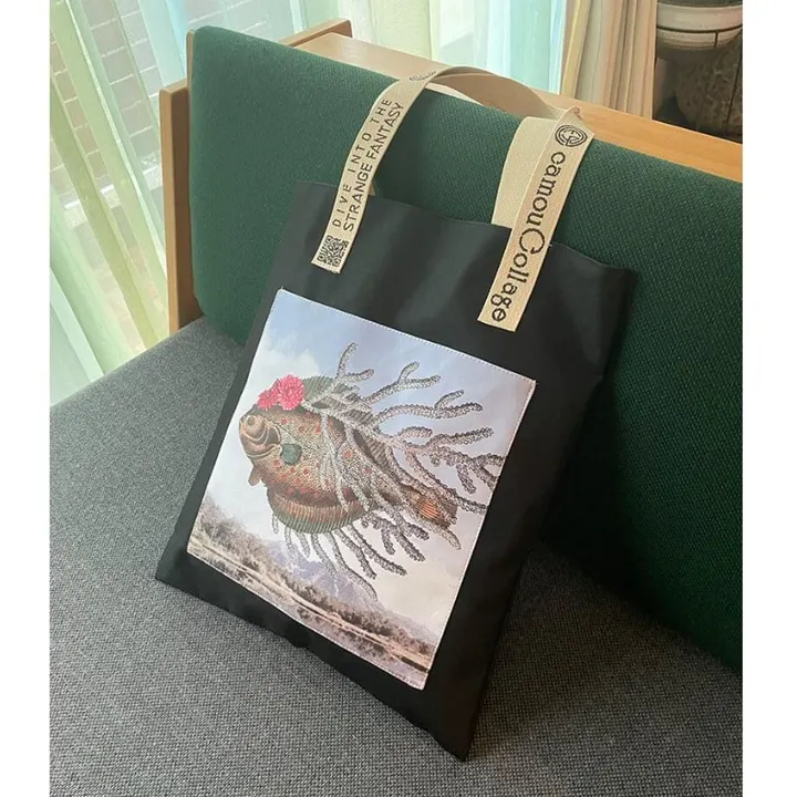カモコラージュの人気絵画が、そのままバッグになりました! PC、ノート、雑誌などがすっぽりと入る、通勤通学などの普段使いにぴったりのサイズです。 生地は丈夫なポリエステルを。 水にも強く、軽い・丈夫・汚れにくいと三拍子揃っています。 ポケット部分は発色の良いPVレザーを使用。 アートの色合いがそのまま再現されています。 紐は石川県にある老舗の紐メーカーさんとデザインからおこしました。 カモコラージュ完全オリジナル、こだわりが詰まったアートバッグになります。