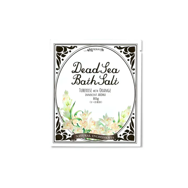 〈こちらのサンプルは、ネコポス385円(税込)にて発送可能です(80g 6袋まで)〉 100%死海ミネラル塩に天然精油、天然クチナシ色素を使用したバスソルトです。【合成香料・合成着色料 不使用】 イノセント・シリーズはワンランク上の「至高の優雅な香り」を楽しめる、繊細な香りのハーモニーを創造しました。 死海塩にはマグネシウムを中心に、多種のミネラルが絶妙なバランスで含まれているのが特徴です。 ミネラルはお肌に潤いを与え、皮膚を健やかに保ちます。また、温浴効果で体を芯から温めます。独特な死海ミネラルのご入浴をご家庭でお楽しみいただけます。 サロン様等ではマッサージやトリートメント施術前のフットバスへのご利用も、体が温まり大変人気があります。 ■香り 〈チュベローズ with オレンジ〉 配合精油:チュベローズabs.、ネロリ、キャバッジローズ、ゼラニウム、ラバンジングロッソ、レモングラス、メイチャン、ペパーミント チュベローズは月夜に甘い香りが強くなることから“月下香”という和名を持ちます。 エキゾチックで優雅な香りに爽やかなオレンジフラワーなどが加わり心を開放してくれるリラックス度の高い香りです。 ■お湯の色 無色 ■ご使用方法 約160ℓ〜300ℓのお湯に40〜80gを入れて、かき混ぜてからご入浴してください。 ※お肌の状態や香りの好みでご自分に合う量を、又乾燥しているお肌には最初は少なめに入れてお試しください。 ※香りを抑えながらミネラル濃度だけを上げたい時はナチュラル(無香料)のデッドシーバスソルトを足して下さい。 ※ご入浴後は残り湯を放置せず早めに排水し、浴槽や循環フィルターを水洗いしてください。 ※色や香りがついている残り湯での、白色や下ろしたての衣類の洗濯はおやめください。