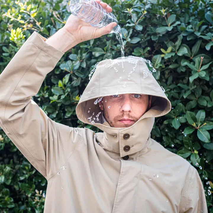 【Silver A' Design Award受賞】 イタリアで行われる世界で最も大規模かつ影響力のある国際デザインアワードの一つ「A' Design Award & Competition 2022-2023」において、上位3-5%に与えられる「Silver A' Design Award」を受賞しました。 【「lifehacker(ライフハッカー)[日本版]」「GIZMODO JAPAN(ギズモード・ジャパン)」「no-ma(ノーマ)」掲載】 「万能」このコートを一言で表すなら、この言葉。 「雨」でも「晴れ」でも 「フォーマル」でも「カジュアル」でも あらゆるシーンに対応できる「全天候型万能コート」です。 コンセプトは『"ハレ"の日に着る、レインコート』 『"ハレ"の日に着る、レインコート』には2つの意味があります。 一つ目は『"晴れ"の日に着る、レインコート』 「レインコート」と呼んでいますが、"蒸れない"「透湿性8,000g/㎡/24hr」の素材を使っていますので、"蒸れずに"「普通のコート」として使っていただけます。 そして、ゲリラ豪雨などが来ても「耐水圧20,000mm」「JIS規格の最高水準である撥水性5級」という高スペックの「レインコート」として使えます。 二つ目の意味は『"ハレ"の日に着る、レインコート』 結婚式、入学式、卒業式、授業参観など、「特別な行事の時(ハレの日)」にも着ていただけるような「高級感のある素材」を使用し「フォーマルなシルエット」に仕上げました。 「フォーマル」なだけではなく、フードをつけるとぐっと「カジュアル」になりますので、普段着としても使っていただけます。 仕事帰りに「釣り」なんて使い方も。 「雨」でも「晴れ」でも ■嵐に耐える「耐水圧20,000mm」 ■最高水準の「撥水性5級」(JIS規格) ■蒸れない「透湿性8,000g/㎡/24hr」 ■風をシャットアウトする「防風性」 ■取り外し可能なフードも「止水ファスナー」 ■ポケットの中身を守る「止水ファスナー」 ■もちろんフロントも「止水ファスナー」 ■縫い目は「止水テープ」で防水加工 「フォーマル」でも「カジュアル」でも ■伝統的シルエット&現代的アレンジ ■高級感ある質感の「高級素材を使用」 ■「ビジネスシーン」でも使用可能 ■フードをつければ「カジュアル」に ■軽く羽織っても見えない「ファスナー」 ■襟を立てても見えない「ファスナー」 ■大手アウトドアブランドの製造も請負う技術力の高い日本の縫製工場で縫い上げました。