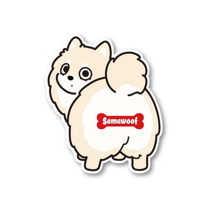 大人気のSomewoofオリジナルのポメラニアン(クリーム)のステッカーの単品販売です。 人気イラストレーター hoppeさん描き下ろしの犬種イラストのお尻にSomewoofのロゴが入ったかわいらしいステッカーです! シール交換やギフトにもってこいなかわいいアイテムです! サイズ:W55m×H65mm 仕様:屋内用 材質:ミラーコート