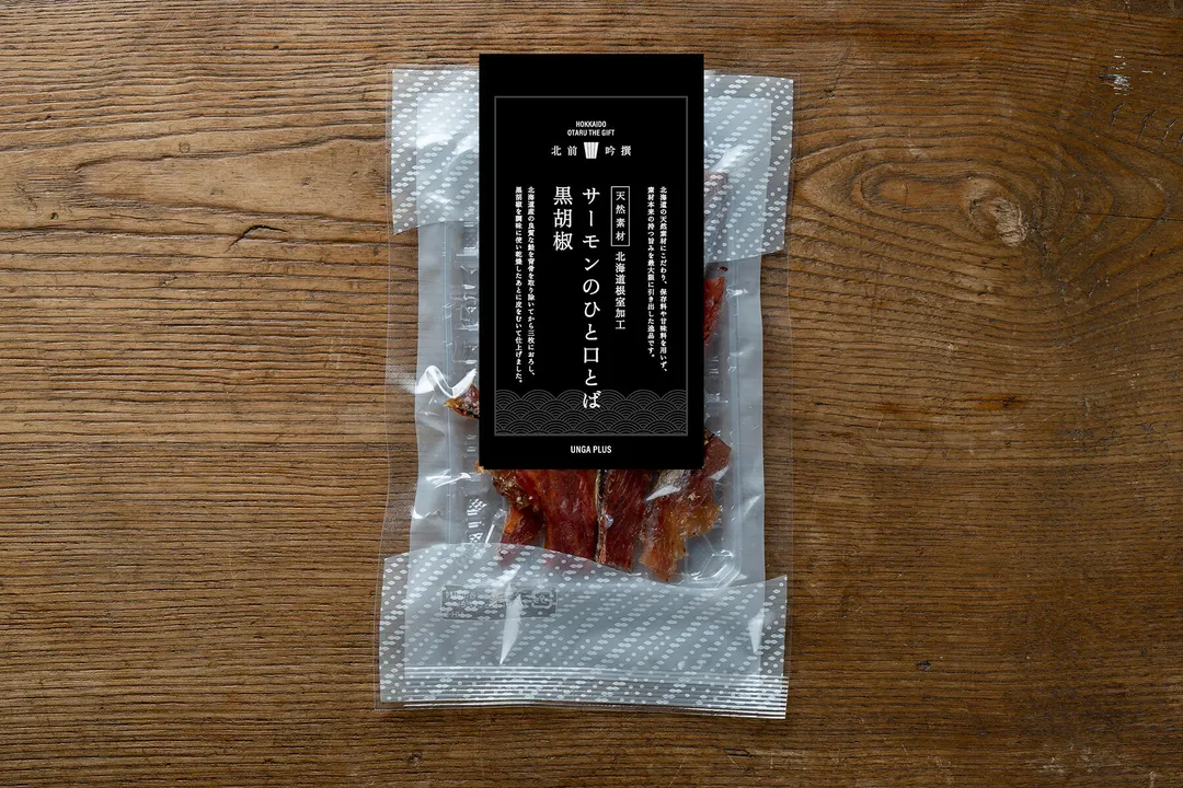 秋鮭を原料に背骨を取り除き3枚におろし、食べやすいように皮を剥きひとくちサイズに乾燥させたおつまみです。ブラックペッパーを隠し味に使用しております。 北海道で獲れた新鮮で良質な水産物を使用し、素材の旨味を最大限に活かした珍味です。味付けには北海道産の昆布を使った昆布だしと昆布醤油、国産原料で作ったかつおだしとしいたけだし、根室で漁獲されたサンマを使用したさんま魚醤のこだわりの調味料を使用しています。