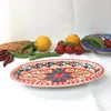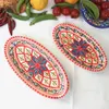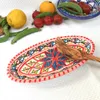 サイズ:約19×9.7×高さ2.5cm ※デザインは入荷時により多少異なることがございます。 チュニジアで陶器の町といえば「ナブール」 鮮やかな手つきでロクロを回し、その後で皿に絵付けをしている女性の手つきの見事さに感嘆。 たくさんある中でもよりすぐりの皿ばかりを選んでおります。 *「ナブール」は観光客だけでなく、チュニジア人でも陶器を買いに行くときは「ここ!」、というほど陶器の街として知られています。 この町の工場で職人が1点1点鮮やかな手つきでロクロを回し、皿に絵付けをしている女性の手つきの見事さに感嘆します。 中心から放射線状に広がる模様は、ほとんどの工房がこの柄で絵付けするほどオーソドックスです。 色鮮やかな文様は食べたあとでも食卓を華やかに演出してくれます。