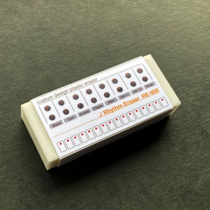 リズムマシンをモチーフにした消ゴム リズムイレーサー【RhythmEraser RE-909】です。 硬質なキックとざらついたハットが聴こえてきそうです! 飛び跳ねるリズムが浮かんできて仕事がはかどるかもしれません。 あなたのステーショナリーケースにいかがですか。 <商品内容> 本体(Custom Sleeve Design Plastic Eraser) 説明書