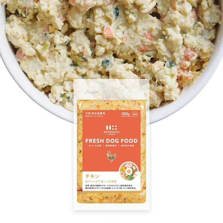 チキンメニューは、全メニューで一番人気のごはんです。グルテンフリー、グレインフリーのレシピで、良質な国産鶏肉をメインに、食物繊維が豊富でワンちゃんが大好きなさつまいも、にんじん、卵、小松菜、すりごま、フィッシュオイル、亜麻仁オイルなど、10種類以上の自然食材を使用しています。全犬種全年齢で主食でもトッピングでも召し上がっていただける総合栄養食です。全年齢で食べやすいように食材は細かくカットし、スチームで柔らかく混ぜ合わせています。リニューアルで寒天を加えることで取り出しやすくなりました。 ・皮膚や被毛の健康をサポートするオメガ3・6脂肪酸を配合 アンチエイジングや免疫力をサポートするブロッコリースプラウトを配合 ・腸内環境をサポートするシールド乳酸菌/ビフィズス菌/オリゴ糖を配合 タンパク質とカルシウムが豊富なため、成長期の子犬に最適で、食いつきも抜群なため成犬からシニア犬まで長期にわたって与えるのにおすすめです。 ※グルテンフリー ※グレインフリー ※遺伝子組換え原材料不使用 ※着色料、発色剤、香料、保湿剤、乳化剤、増粘安定剤、凝固剤、pH調整剤、保存料、酸化防止剤の添加物 一切不使用 原材料:国産鶏肉(39%)、国産さつまいも(21%)、国産にんじん(17%)、国産卵(8%)、国産小松菜(5.7%)、すりごま(1%)、寒天(1%)、亜麻仁オイル(0.9%)、フィッシュオイル(0.9%)、ミネラル類(カルシウム、リン、ナトリウム、マグネシウム、カリウム、鉄 、亜鉛、銅、ヨウ素、セレン)、ビタミン類(A、B1、B2、B12、D、E、コリン)、ガラクトオリゴ糖液糖、ブロッコリースプラウト粉末、でんぷん分解物、乳酸菌(殺菌)、ビフィズス菌(殺菌)