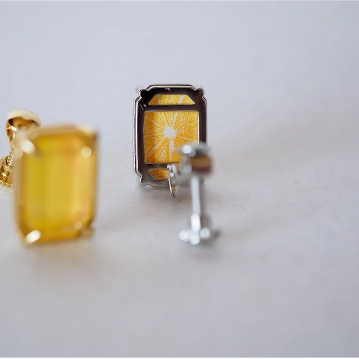 「旬の檸檬」イヤリング/ピアス ※片耳用 「花鳥風月」の「花」=植物 IRO LABではあまりない ”甘め”デザイン でも、従来のデザイン通りに「言われてみると…」程度の主張。 レモンのアクセサリーはたくさんありますが、こんなに控えめなものは珍しいかも? 内側を見るとジュワッとジューシーな断面が見えます。 誰かとの会話に困ったときに、「これ見て!実はね…」なんて 裏側を見せてお話するのも楽しそうだなと思っています。 季節ごとに果実を出荷する予定です。 次の「旬の果物」も楽しみにしていてください。 【size】 縦:14㎜ 横:10㎜(イヤリング・ピアス金具入れず) 【material】アクリル アクリル板をレーザー加工にてカットしています。 UVプリンターにて、写真を裏側からプリントしています。 その為、表から見ると奥行きのある小さな風景になります。 ※注意※ アクリル・UVプリント共に、アルコールに弱い性質を持っています。 指紋が付いたりした時は、プリントをしてない面のみをメガネ拭きなどの柔らかい布でそっとふき取ってください。 _______________________________ Instagramでもご覧ください https://www.instagram.com/irolab/