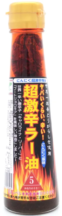 ★テレビ番組(有吉ゼミなど)や、YOUTUBEなどの激辛企画で、しばしば紹介されている超激辛ラー油です!本当にヤバい辛さですので、ご使用の際は分量などにくれぐれもご注意ください。 ★ギネス世界一認定の激辛とうがらしを使用!(キャロライナ・リーパー、ブートジョロキア) ★美味しくて激辛「ただ辛いだけではありません」香味野菜をたっぷり使用した超激辛辣油です! ★辛さは5辛・10辛・15辛・20辛、にんにく5辛・にんにく10辛・にんにく15辛・にんにく20辛の全8種類。20辛は一般的なラー油の50倍以上の辛さです。 ★ラーメン・麻婆豆腐・パスタ・焼きそば・焼き肉中華風冷奴・エビチリ・担担麺・塩焼きそば・おひたし・たこ焼きなど、ぜひお試しください!焼き肉のたれに少し加えたり、味噌汁にもお使いいただけます。豚キムチや鍋料理にも最適です! ★辛い食べ物がお好きな方は是非一度お試し頂きたいラー油です!少しでも辛さが際立つので経済的です。 【原材料・成分】 食用大豆油、唐辛子(キャロライナ―リーパー・ブートジョロキア)、野菜(長ねぎ・生姜)、香辛料、香辛料抽出物 【保存方法】 直射日光、高温多湿を避けて保存してください。
